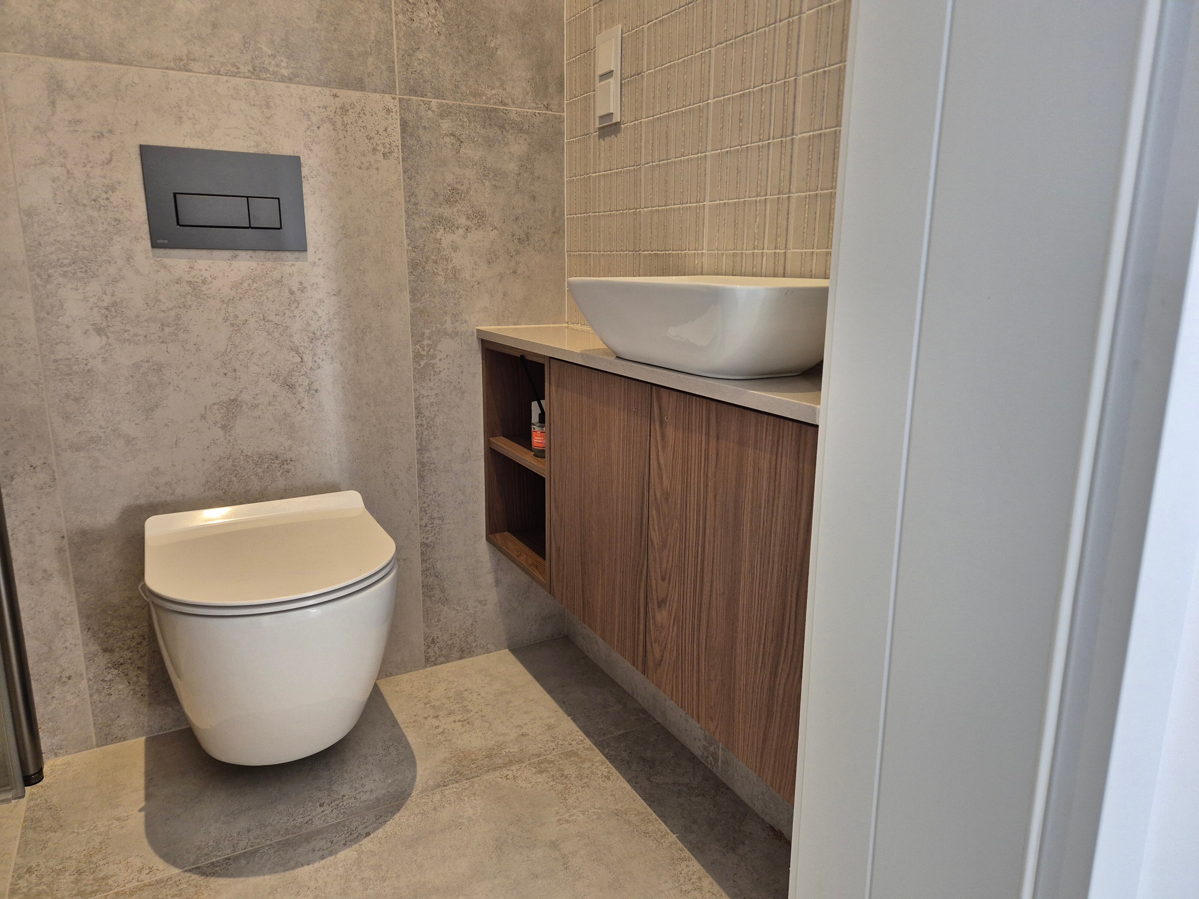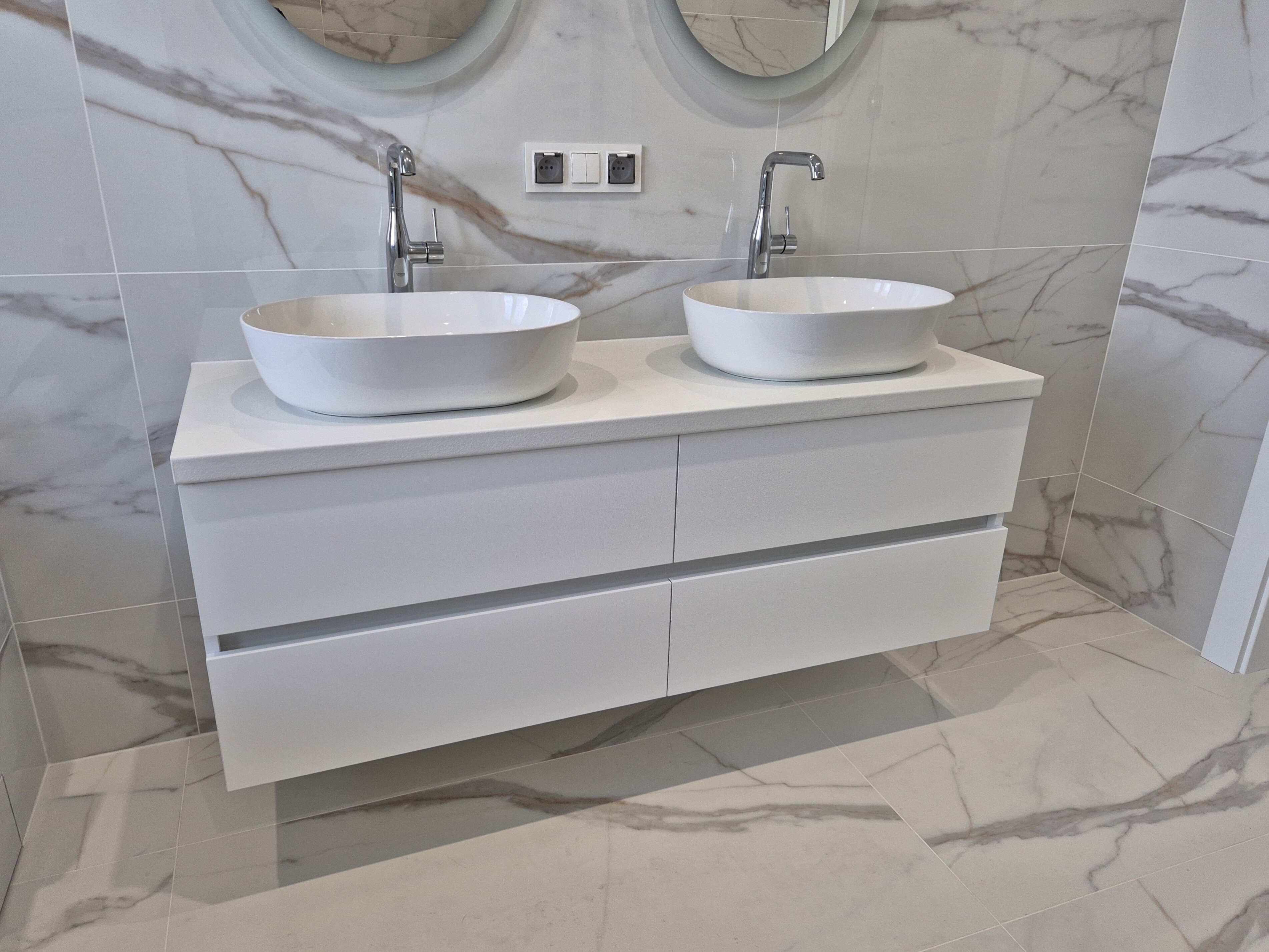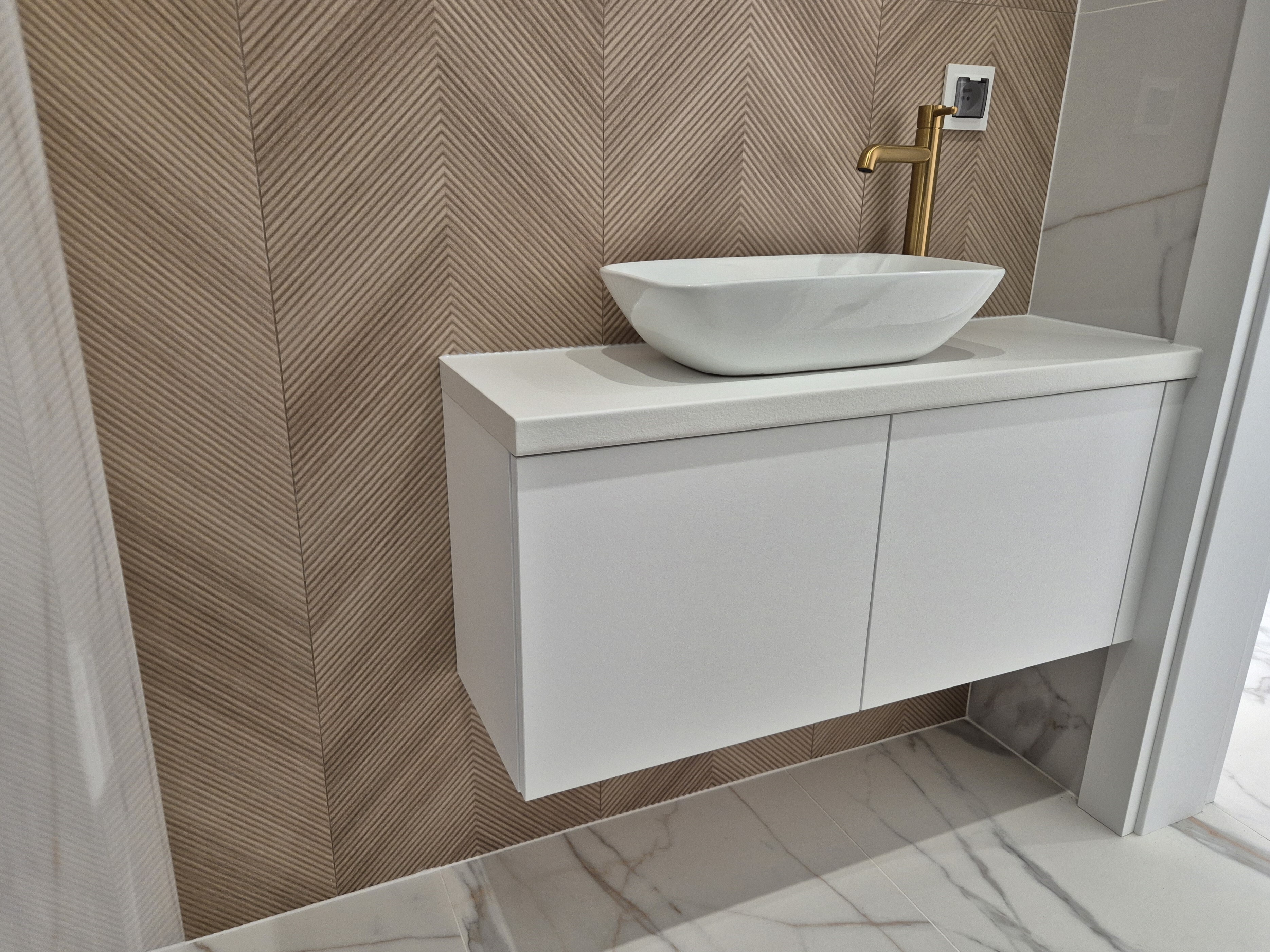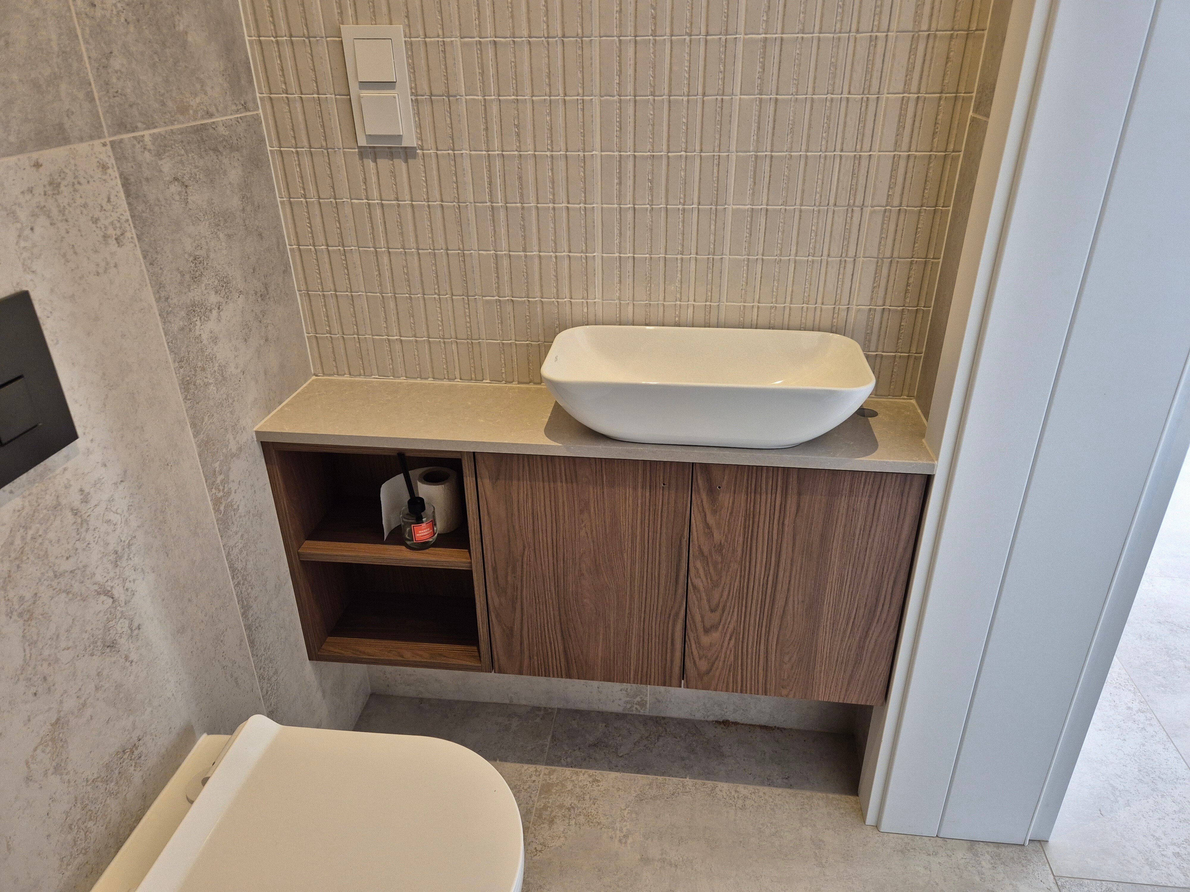 Najczęściej wykonujemy szafki umywalkowe na wymiar (wiszące lub wolnostojące), zabudowy pralek, słupki na detergenty i kosze na bieliznę, a także zabudowy geberitu.